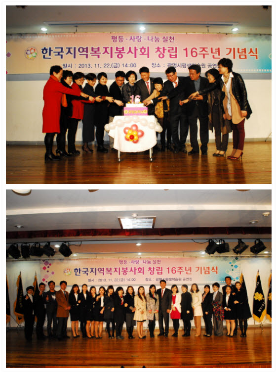 한국지역복지봉사회(이사장 조승철) 창립 16주년 기념식이 지난 11월 22일(금) 광명평생학습원 공연장에서 지역주민과 많은 내빈들이 참석한 가운데 아르메의 실내악 축하공연을 시작으로 성황리에 열렸다.