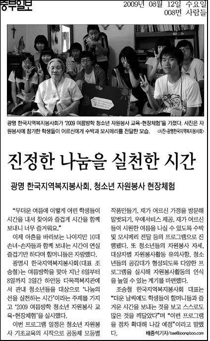 2009년 여름방학 청소년 자원봉사현장체험 페이지 정보 작성자 최고관리자 댓글 0건 조회 5,993회 작성일 09-08-13 00:00 본문 2009년 여름방학 청소년 자원봉사현장체험 목록 이전글사랑나눔을 실천하는 한국지역복지봉사회 09.09.23 다음글광명푸드마켓 개소식2 09.06.10