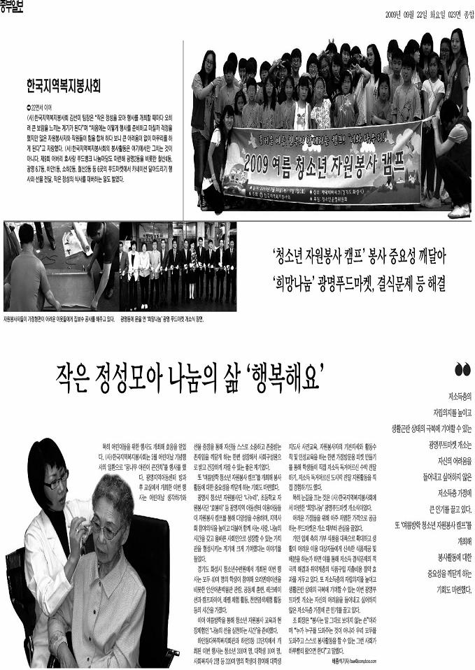 사랑나눔을 실천하는 한국지역복지봉사회 페이지 정보 작성자 최고관리자 댓글 0건 조회 6,239회 작성일 09-09-23 00:00 본문 사랑나눔을 실천하는 한국지역복지봉사회 목록 이전글사랑나눔을 실천하는 한국지역복지봉사회 09.09.23 다음글2009년 여름방학 청소년 자원봉사현장체험 09.08.13