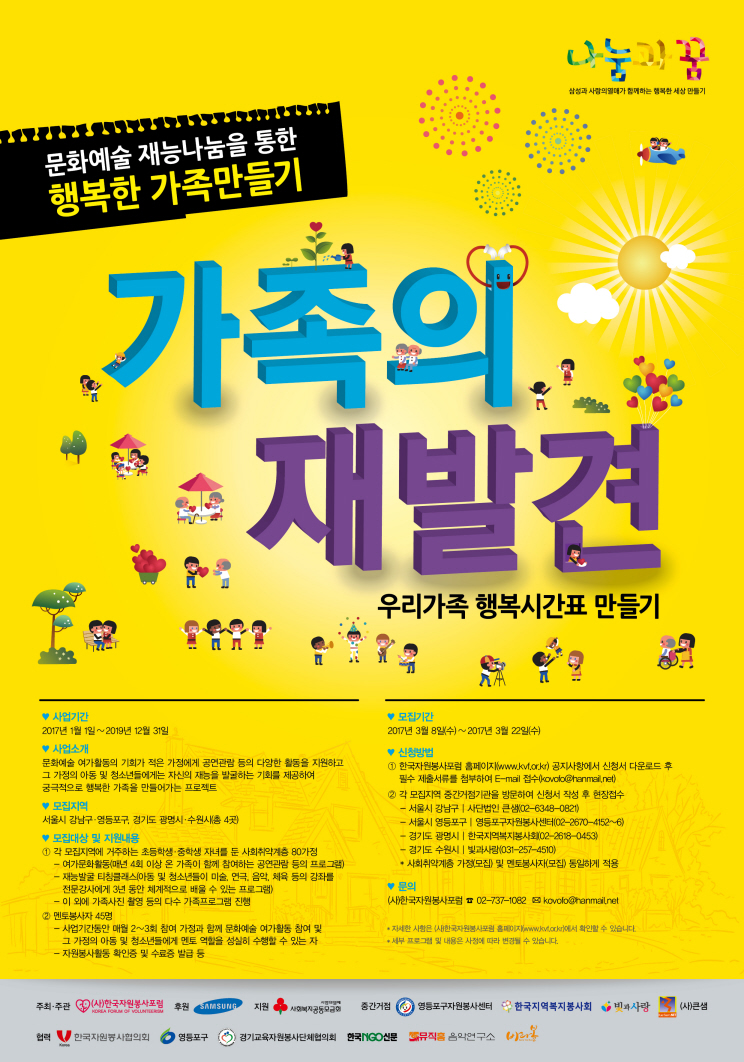 [나눔과꿈] "가족의 재발견" 프로그램 안내 페이지 정보 작성자 한국지역복지봉사회 댓글 0건 조회 13,427회 작성일 17-03-20 00:00 본문 문화예술 재능나눔을 통한 행복한 가족만들기 “가족의 재발견” 목록 이전글나누미 어울마당에 초대합니다 17.03.20 다음글[나눔과꿈] "가족의 재발견" 멘토봉사단 모집 17.03.20