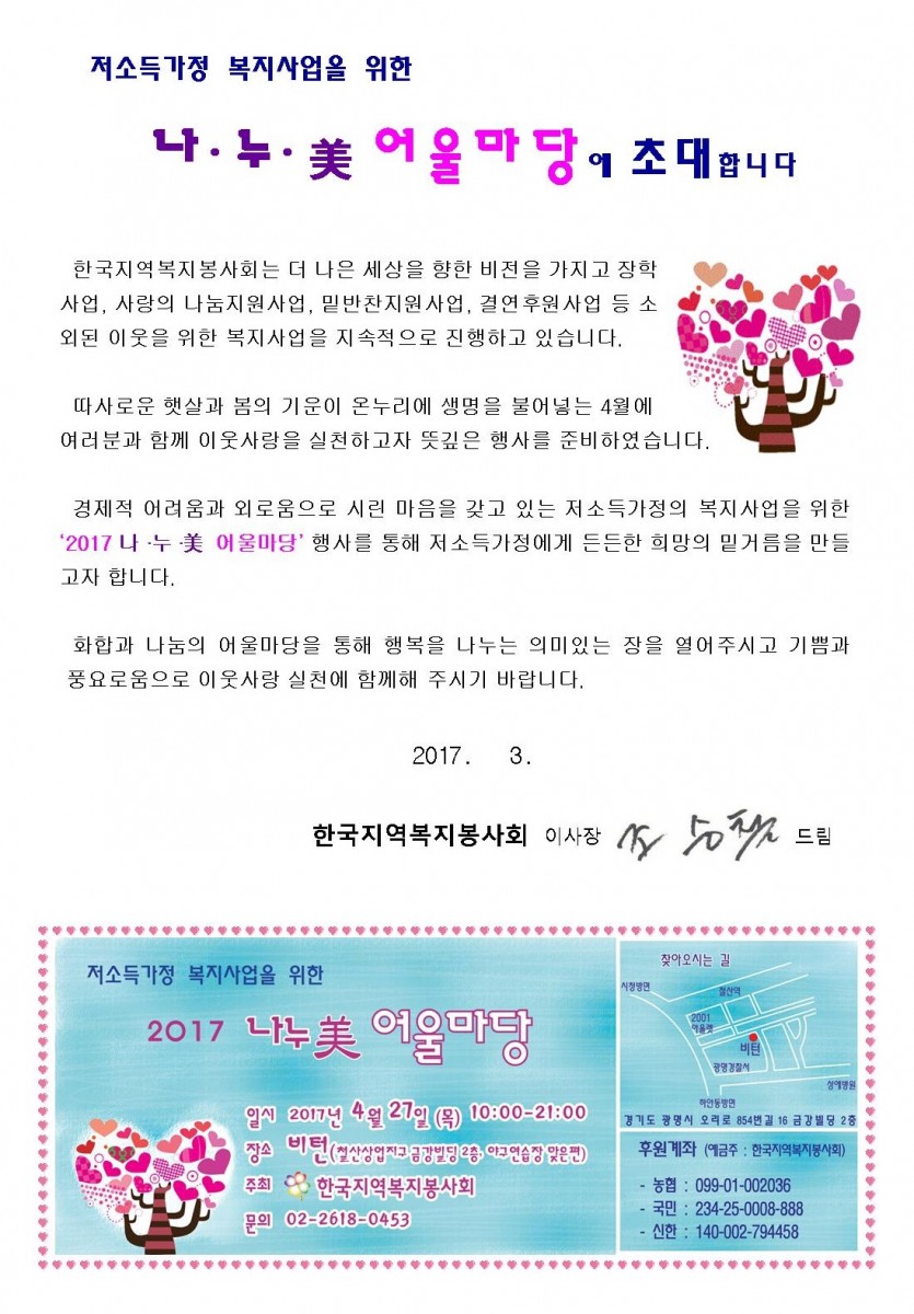 나누미 어울마당에 초대합니다 페이지 정보 작성자 한국지역복지봉사회 댓글 0건 조회 13,280회 작성일 17-03-20 00:00 본문 저소득가정 복지사업을 위한 나누미 어울마당에 함께해주세요^^ 목록 이전글2017년 청소년 자원봉사 현장체험 신청안내 17.07.17 다음글[나눔과꿈] "가족의 재발견" 프로그램 안내 17.03.20
