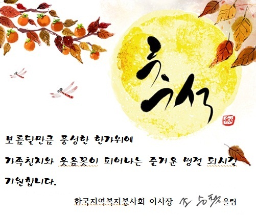 풍요로운 한가위되세요~ 페이지 정보 작성자 한국지역복지봉사회 댓글 0건 조회 11,918회 작성일 15-09-25 00:00 본문 풍요로운 한가위되세요~ 목록 이전글방과후 행복교실 신청 안내 15.10.02 다음글2015년 청소년 자원봉사 교육현장체험 참가 안내 15.07.09