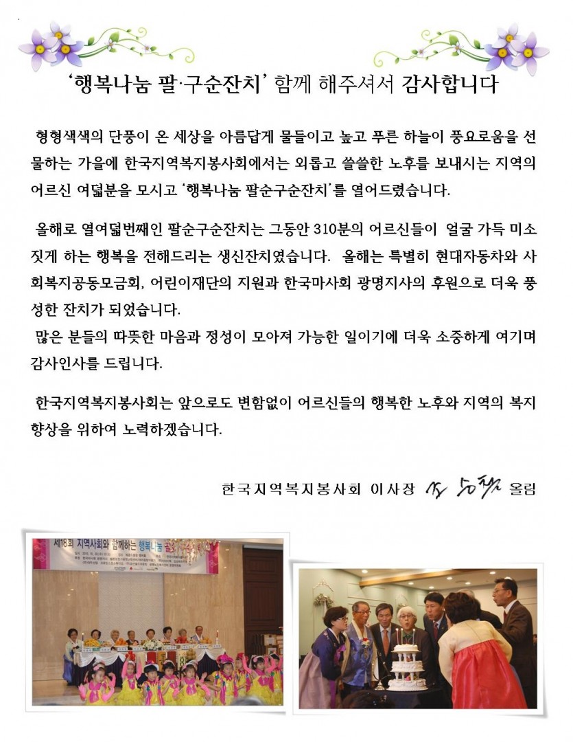 행복나눔 팔순구순잔치 페이지 정보 작성자 한국지역복지봉사회 댓글 0건 조회 11,905회 작성일 15-10-29 00:00 본문 2015년 10월 28일 많은 분들의 정성과 마음이 모아져 여덟분의 어르신들이 행복한 생신잔치를 하셨습니다.함께해주신 모든 분들께 감사드립니다~ 목록 이전글창립 18주년 기념식에 초대합니다 15.12.07 다음글방과후 행복교실 신청 안내 15.10.02