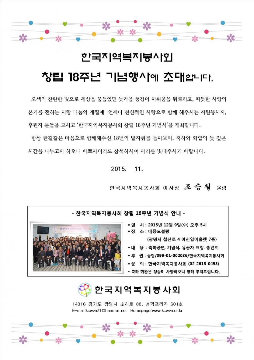 창립 18주년 기념식에 초대합니다 페이지 정보 작성자 한국지역복지봉사회 댓글 0건 조회 11,843회 작성일 15-12-07 00:00 본문 뜻깊은 자리에 함께해 주세요~ 목록 이전글새해 인사드립니다 15.12.31 다음글행복나눔 팔순구순잔치 15.10.29
